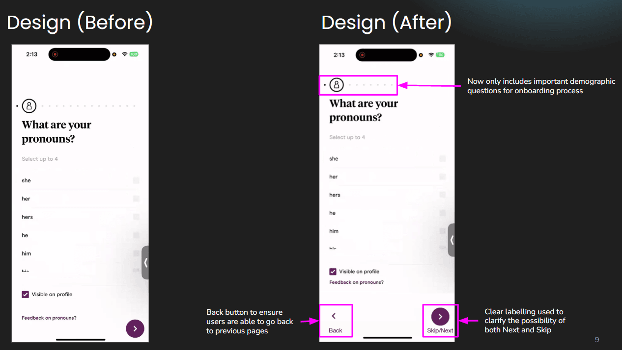 I created a redesign proposal to address the highest impact issues by restructuring verification timing, improving profile edit discoverability, clarifying liking actions, and offering a quick start path.